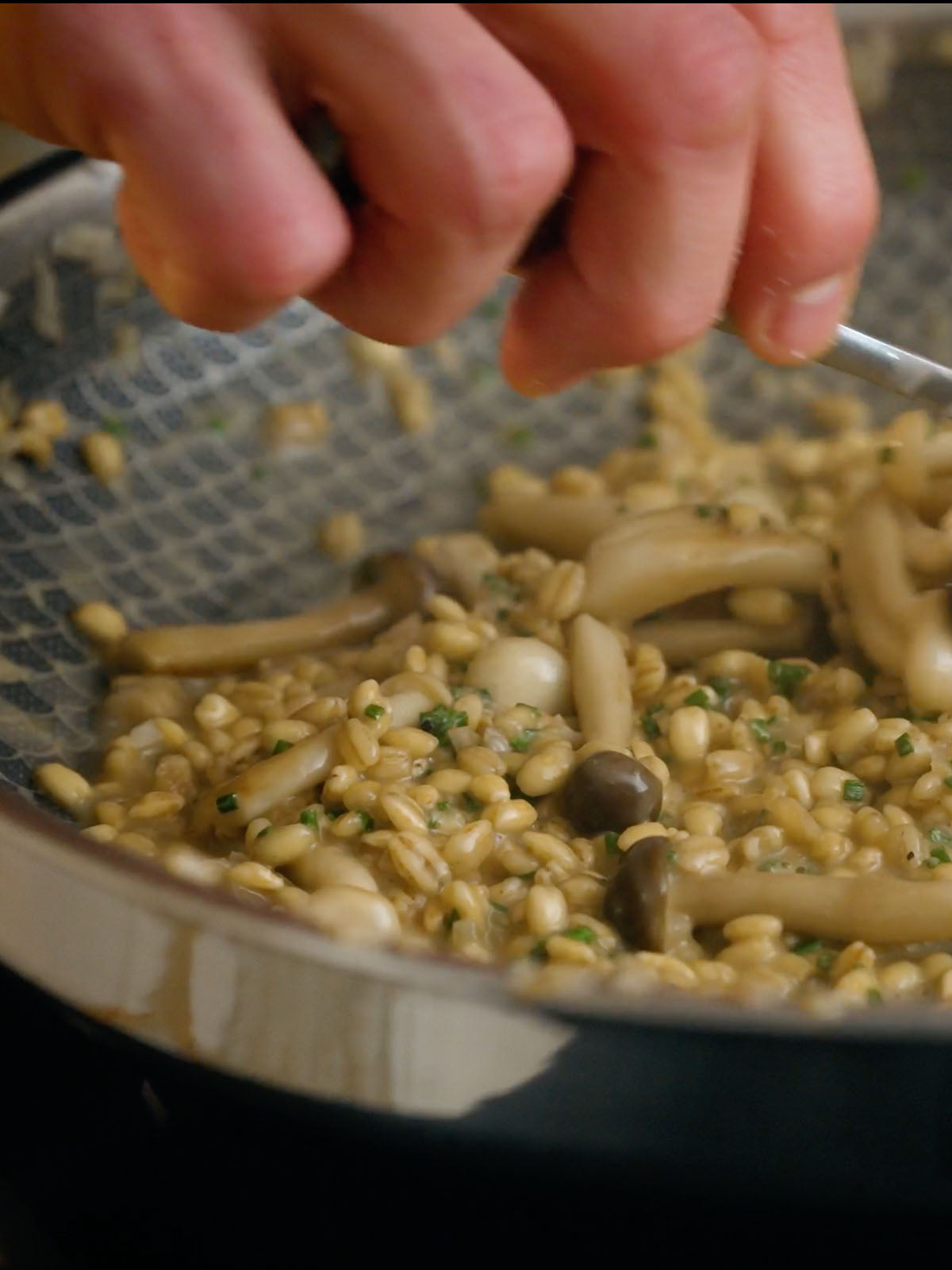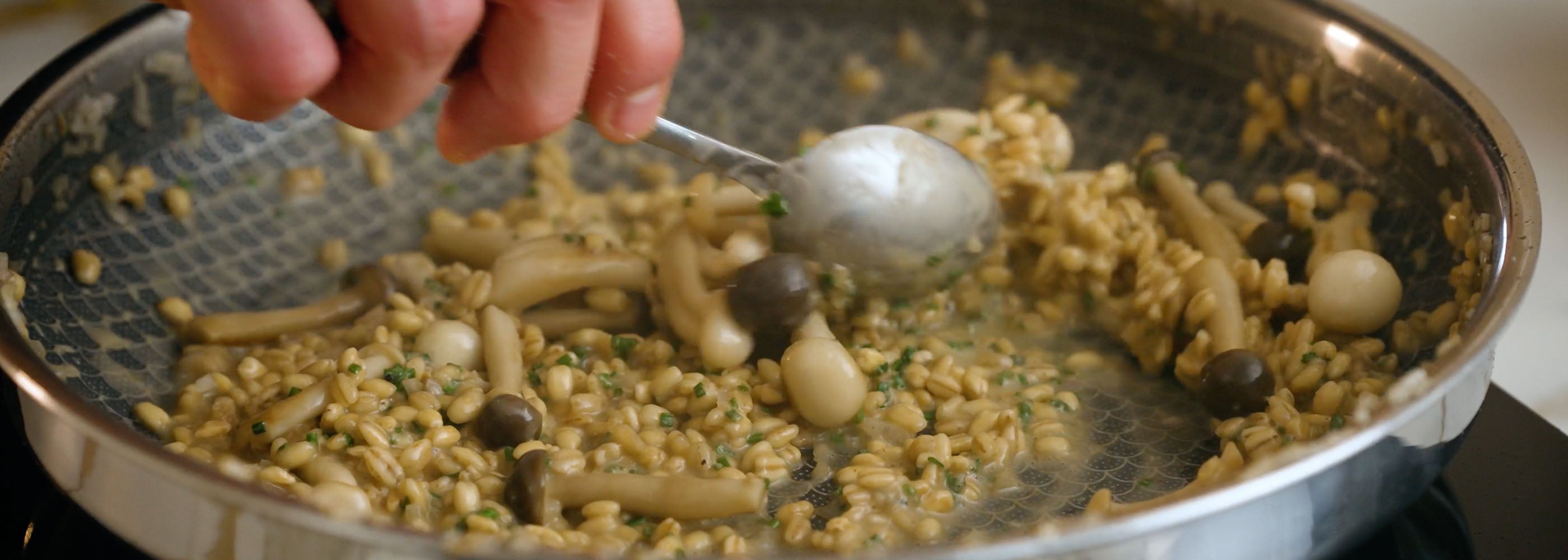 Opvarm en Miso stegepande over høj varme. Tilsæt en smule olivenolie og steg bøgehattene i et par minutter, til de begynder at få farve. Tilsæt skarlotteløg til panden og steg videre, indtil løgene er bløde og gennemsigtige. Rør de forkogte bygkerner ind i blandingen og lad det simre ved middelvarme i 4-5 minutter, indtil bygkernerne er gennemvarme. Skru op for varmen for kortvarigt at "puffe" bygkernerne. Deglacer panden med reduceret hvidvin for at tilføje syrebalance. Tilsæt svampefond og lad det koge ind til risottoen tykner en smule. Når risottoen er reduceret, rør Vesterhavsost, salt og peber ind. Fjern fra varmen, og tilsæt finthakket purløg.