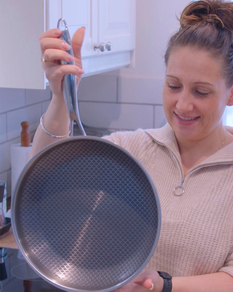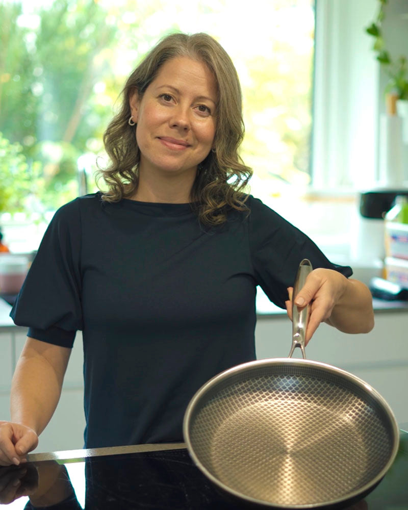 Miso's stegepande er fremstillet med en innovativ Tri-Ply konstruktion, der starter med et lag af magnetisk 430 rustfrit stål for kompatibilitet med alle komfurer. Et lag af termisk aluminium sikrer hurtig og jævn varmefordeling, toppet med hårdført 304 rustfrit stål.