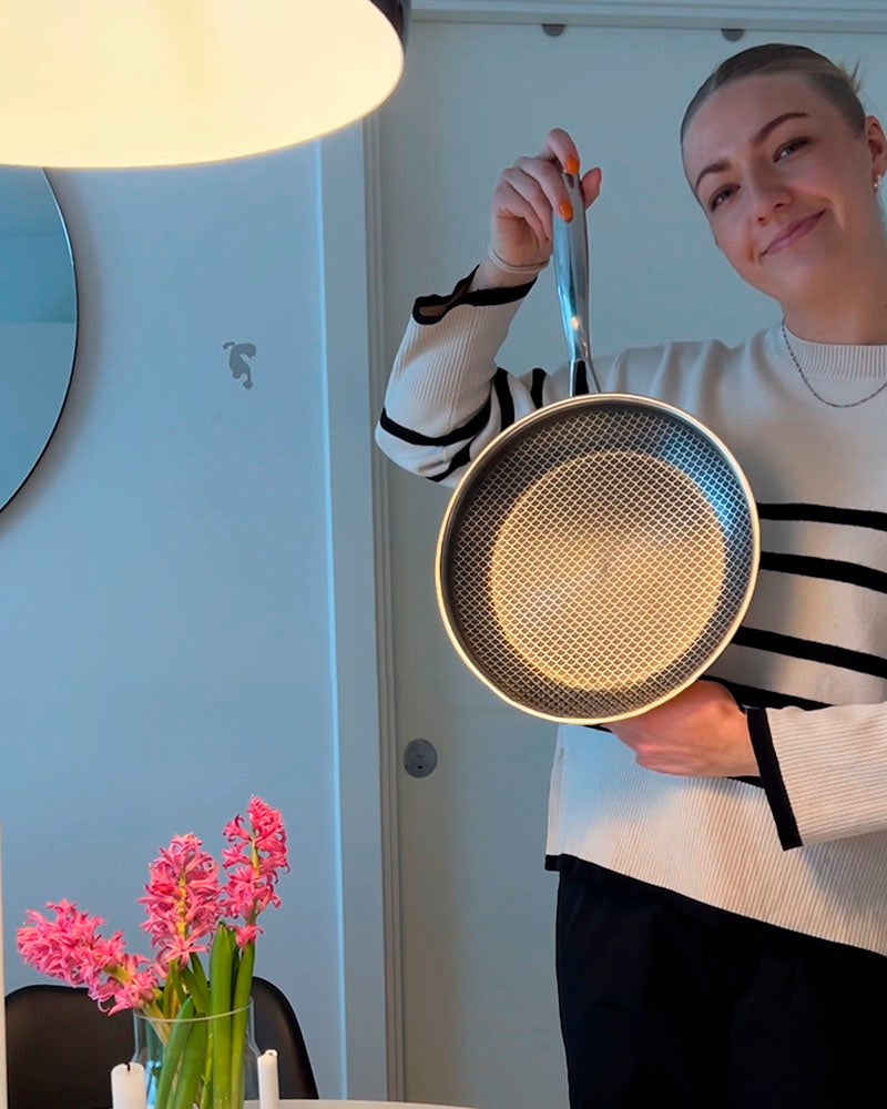 Super lækker kvalitet - Ligger godt i hånden og kommer hurtigt op i temperaturer, hvilket gør den god til stegning.