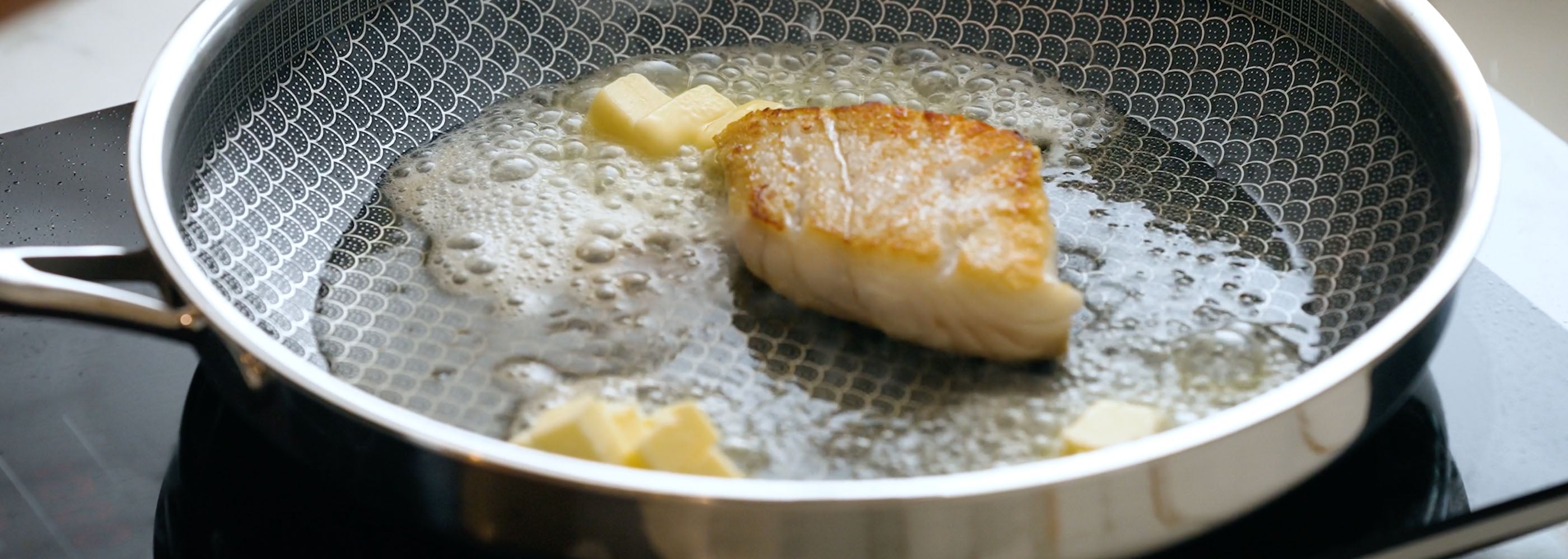 Det trick, der sikrer perfekt stegning af fisken, er at vente, til den slipper panden af sig selv – en proces, der fremskyndes takket være Miso stegepandens egenskaber.